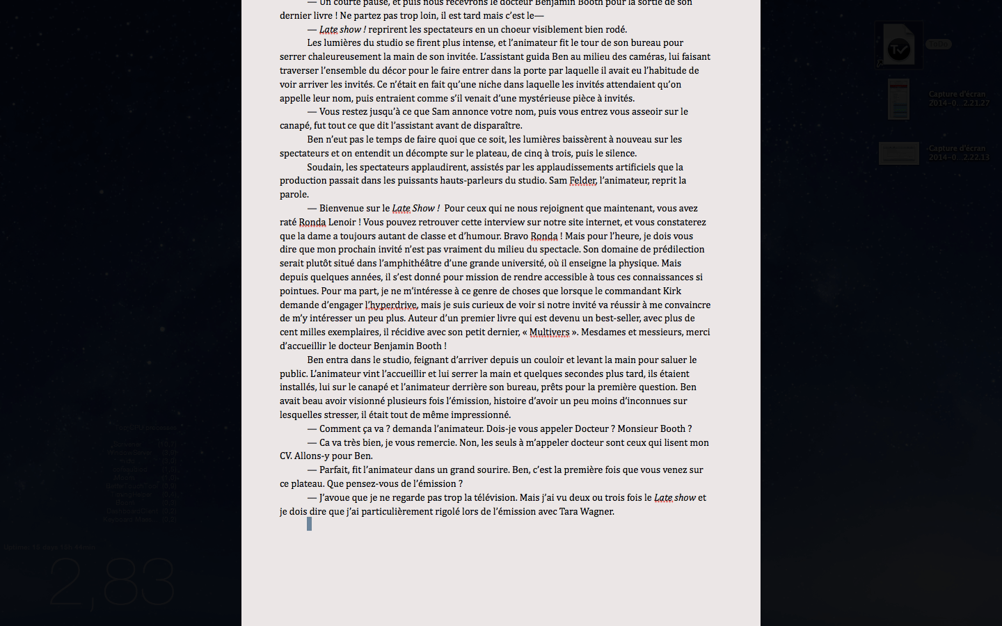 Je ne m’inquiète plus d’avoir sauvegardé mon texte, du niveau de ma batterie, ou d’un plantage du logiciel (encore que Scrivener n’a jamais planté une seule fois depuis que je l’utilise, toutes versions confondues).